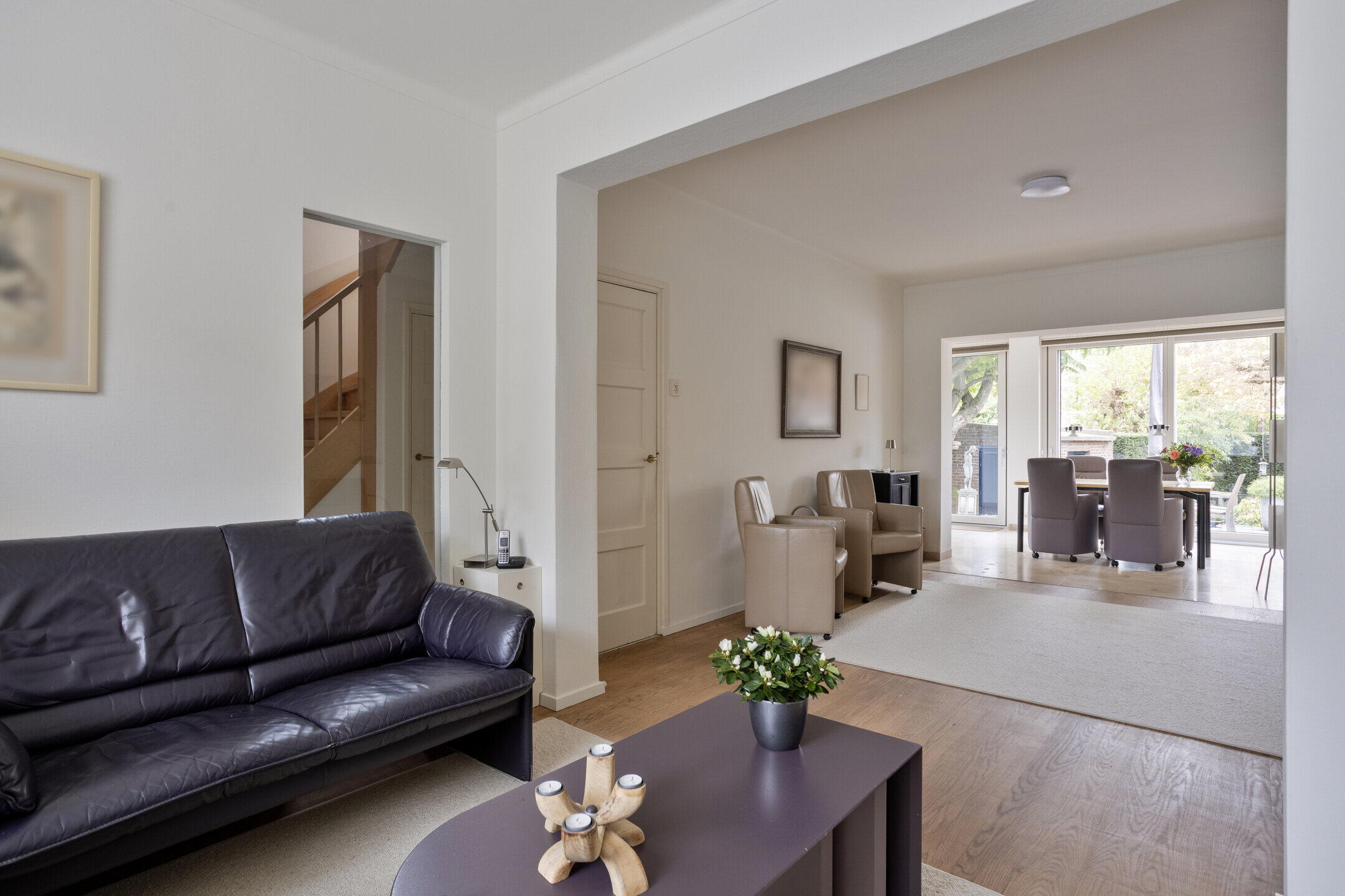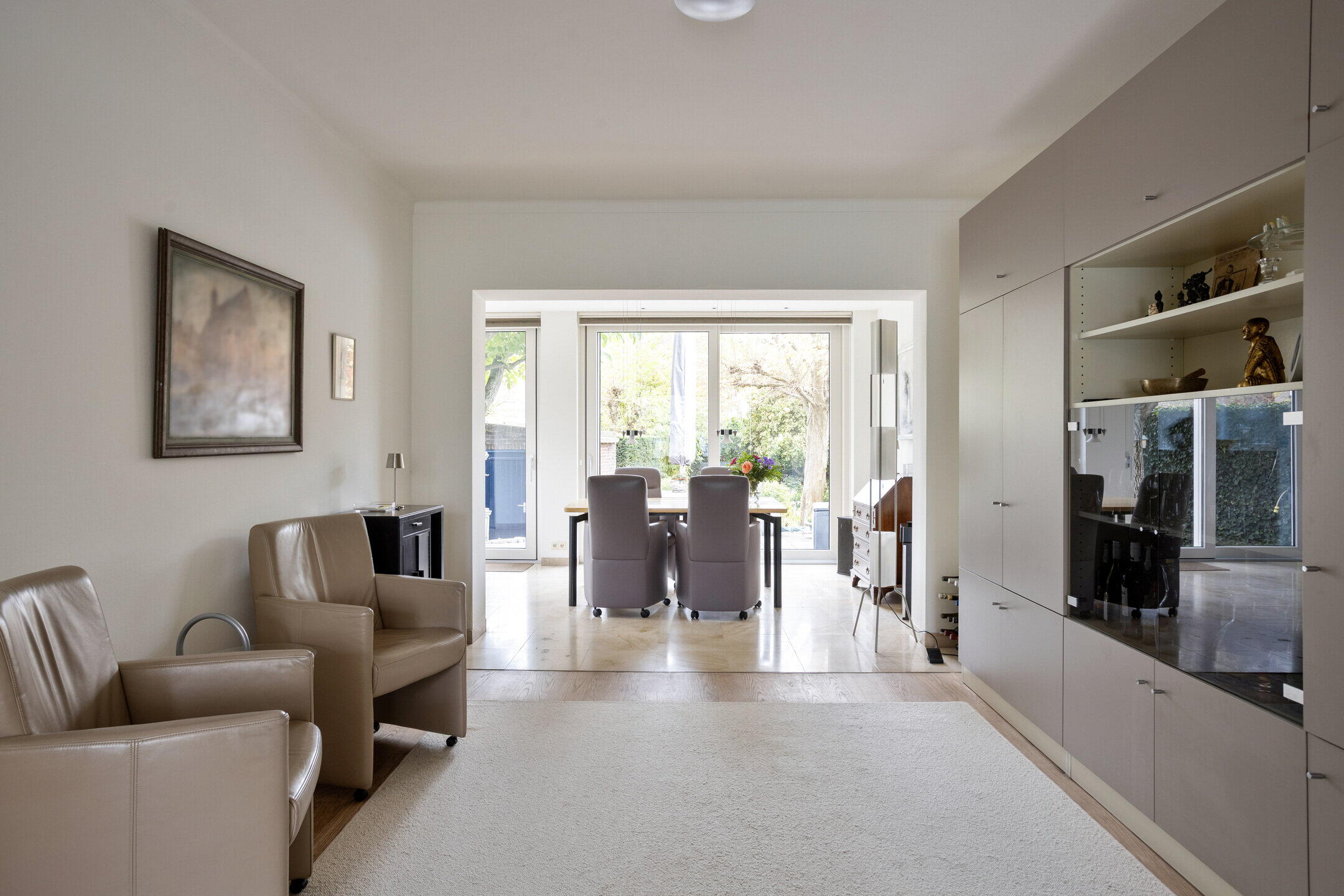 Heldere doorzonwoonkamer (ca. 28 m²), gelegen aan de voorzijde van de woning, met grote glaspartijen aan voor- en achterzijde.