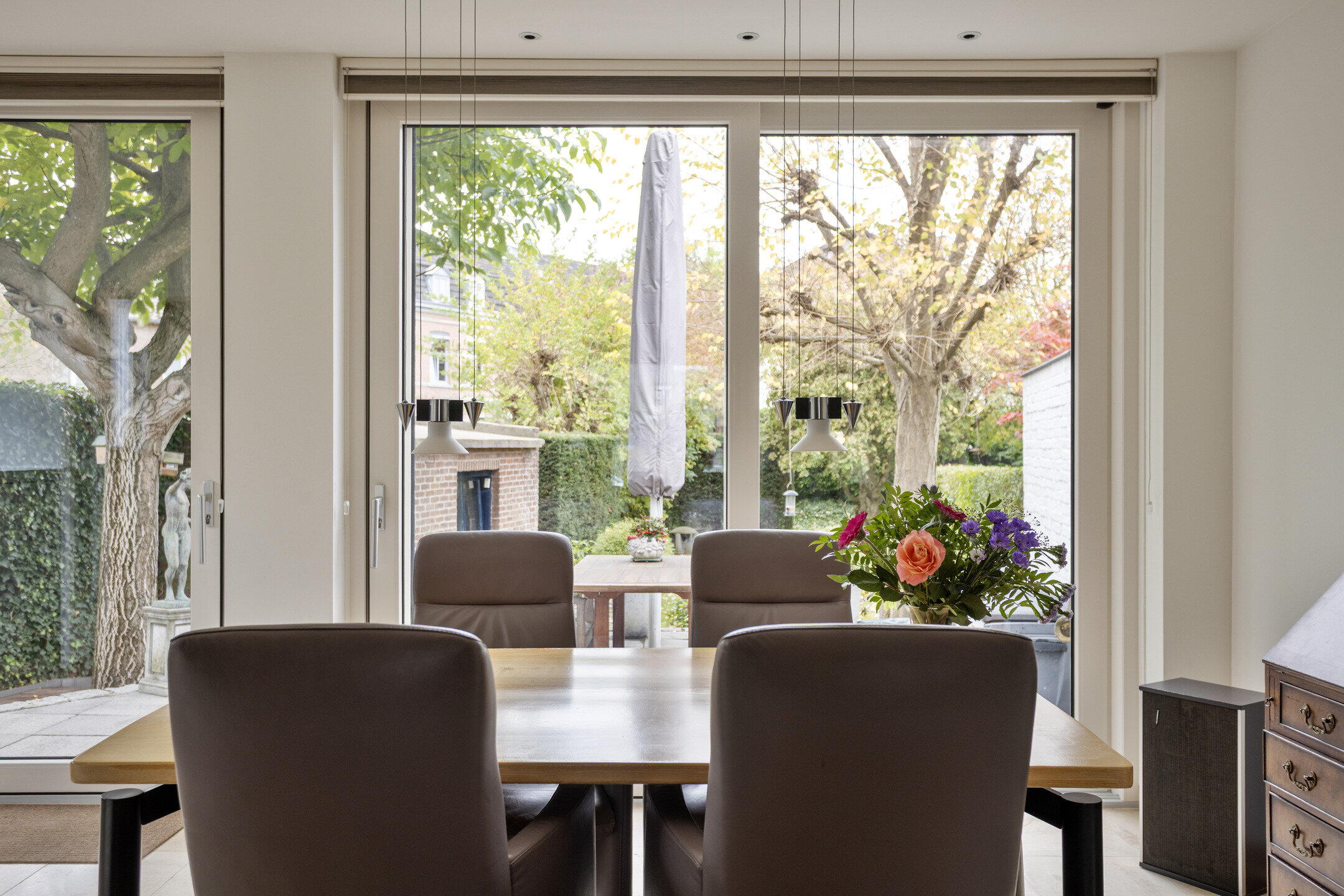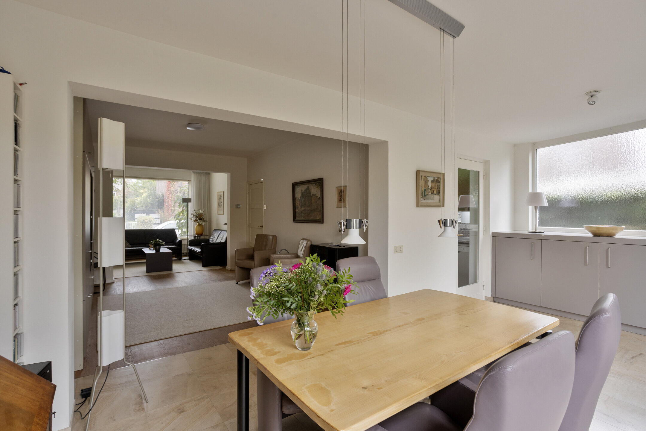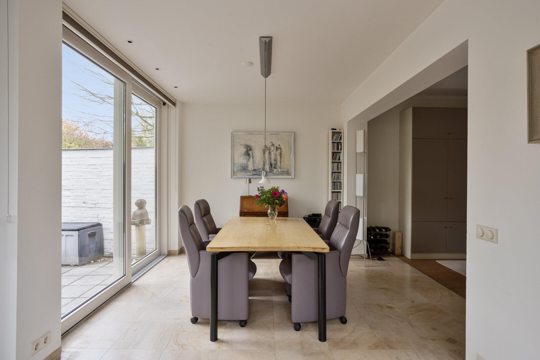 De eetkamer (ca. 15 m²) is in de uitbouw gelegen aan tuinzijde, voorzien van vloerverwarming en heeft een fraai uitzicht over de achtertuin. Via een dubbele schuifpui is het terras en de tuin toegankelijk.