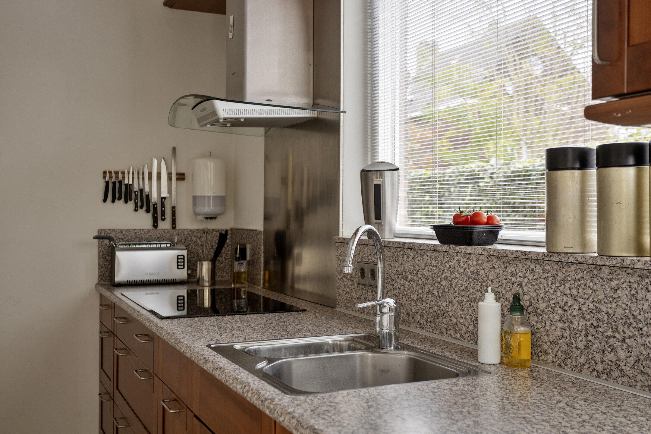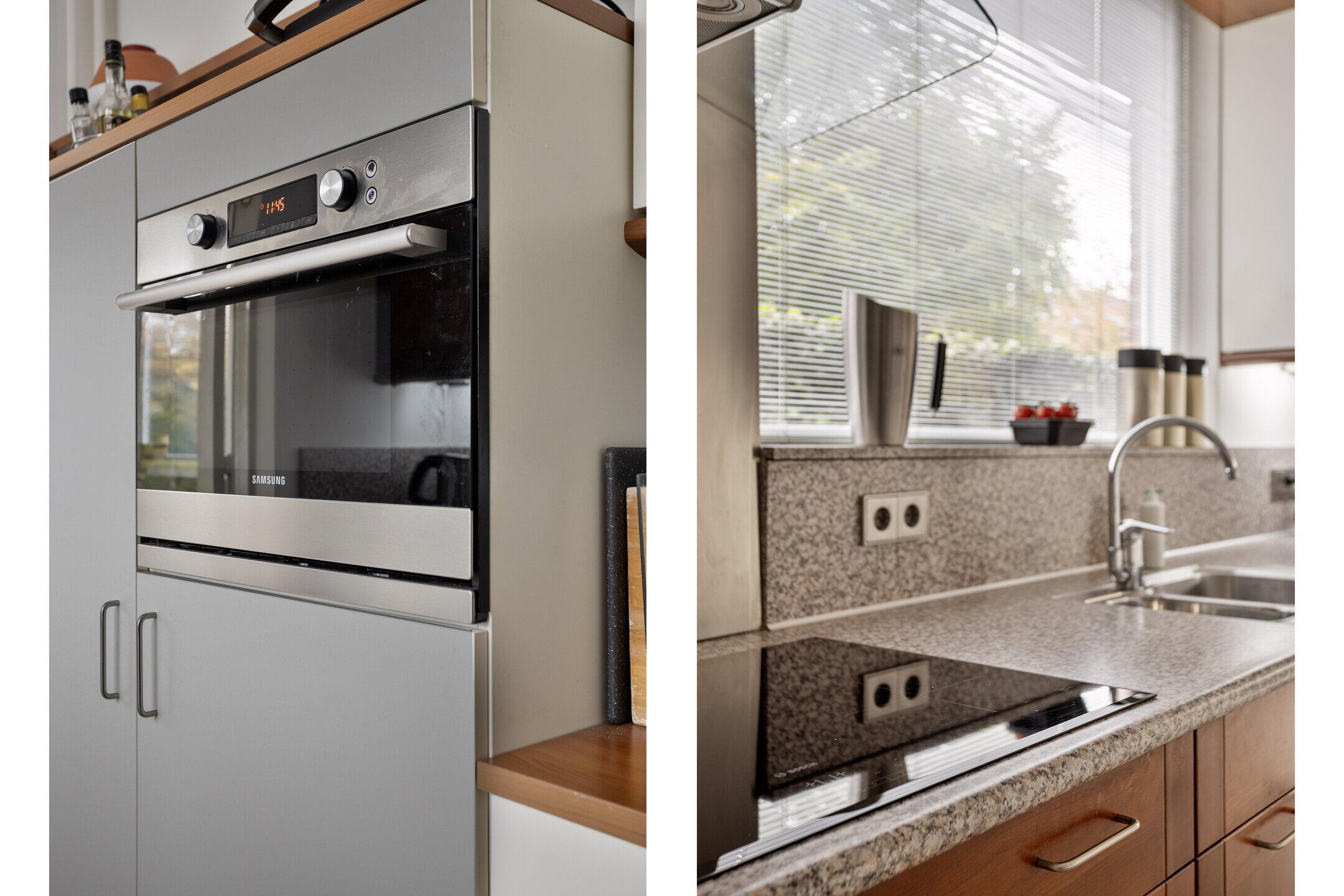 Gesloten keuken (ca. 9 m²), voorzien van een marmeren vloer en een keukenopstelling met een ca. 70 cm diep kunststof werkblad, spoelbak, combioven, 5-pits inductieplaat, afzuigkap, vaatwasser en koelkast.