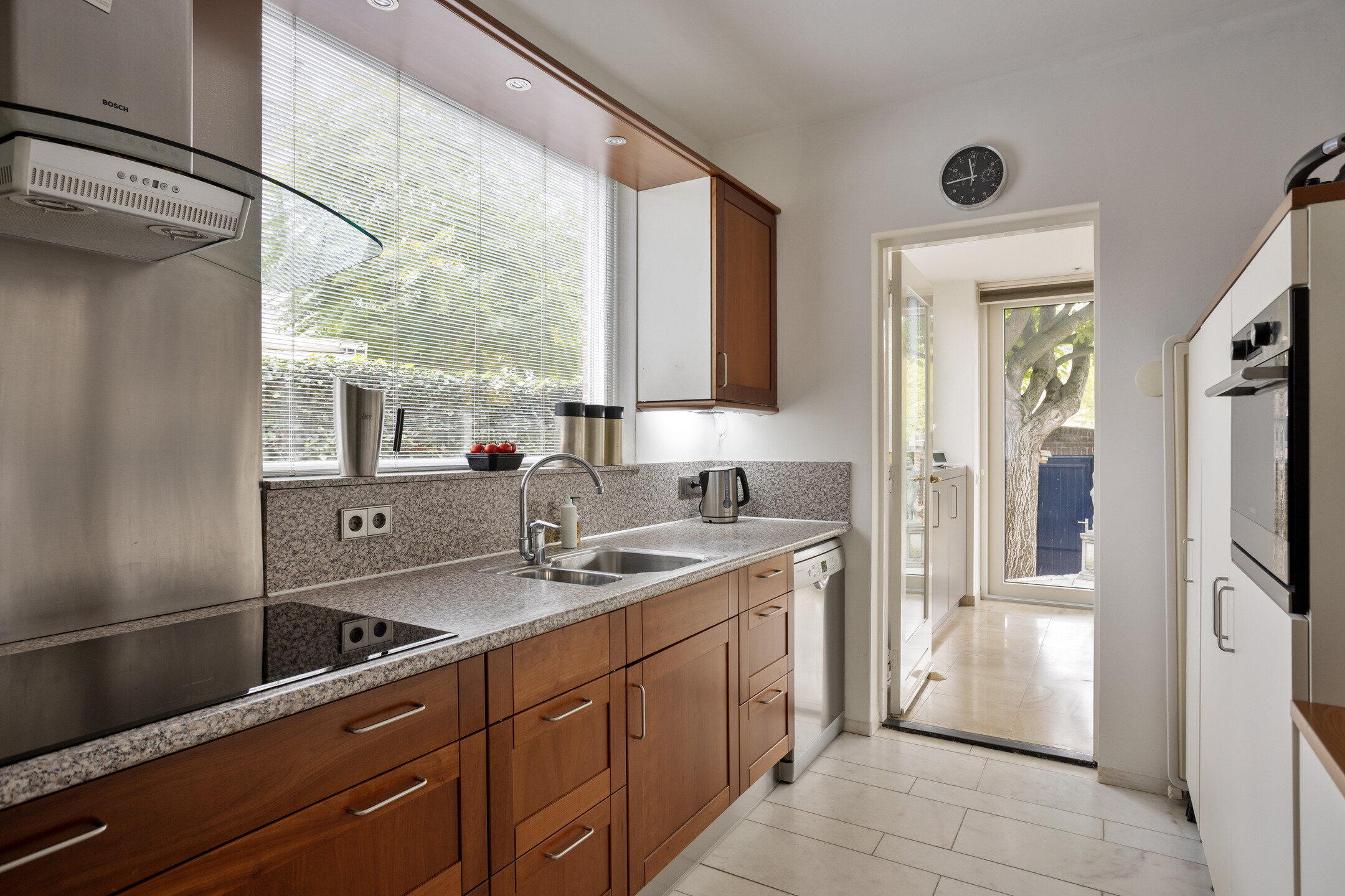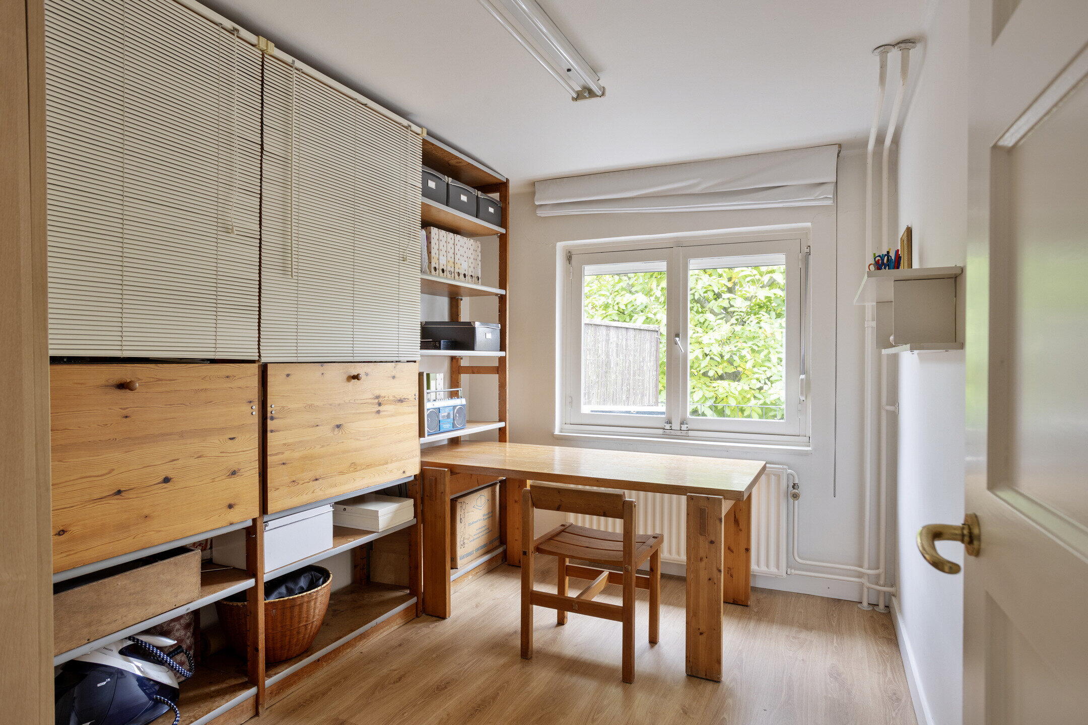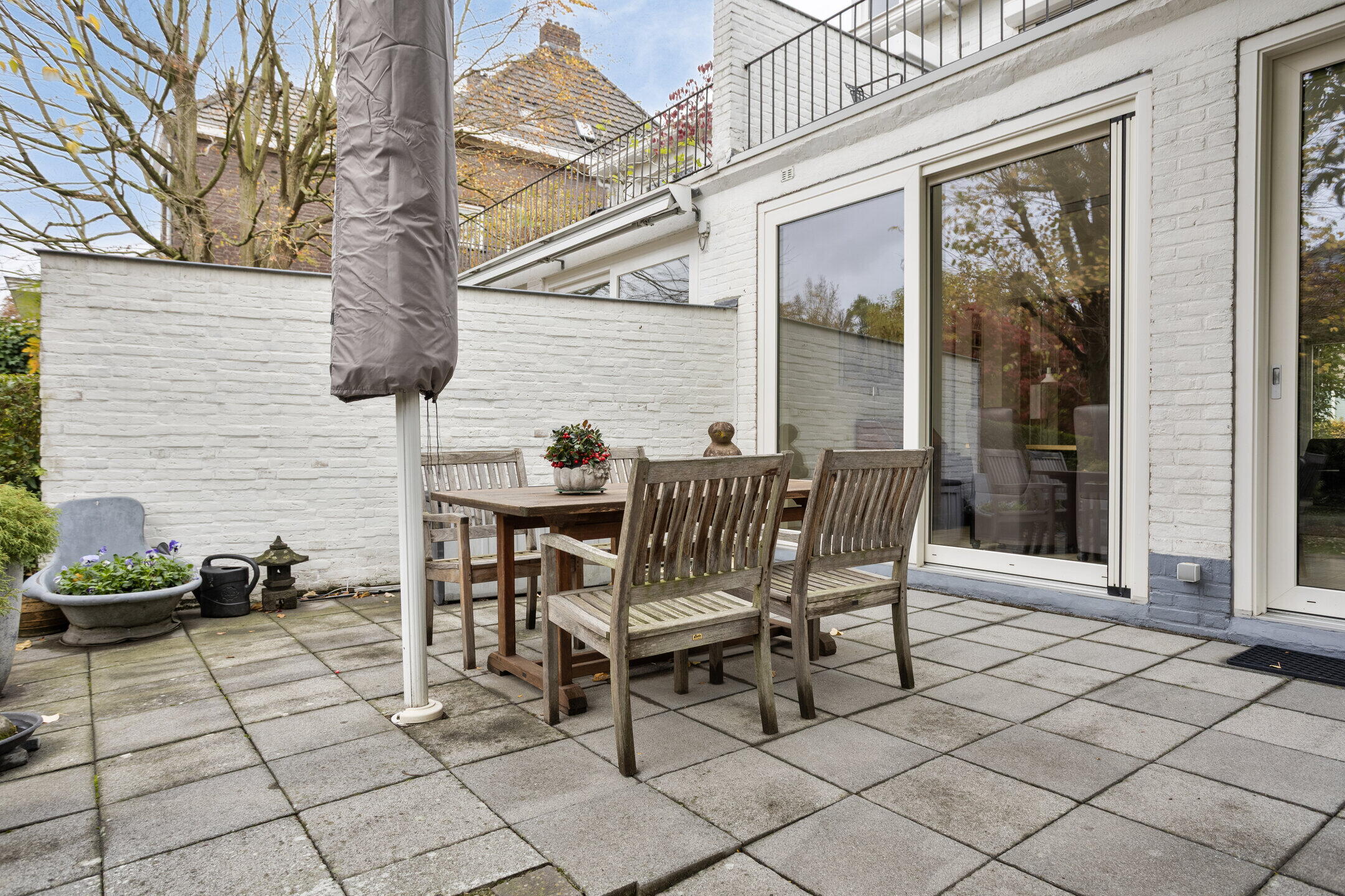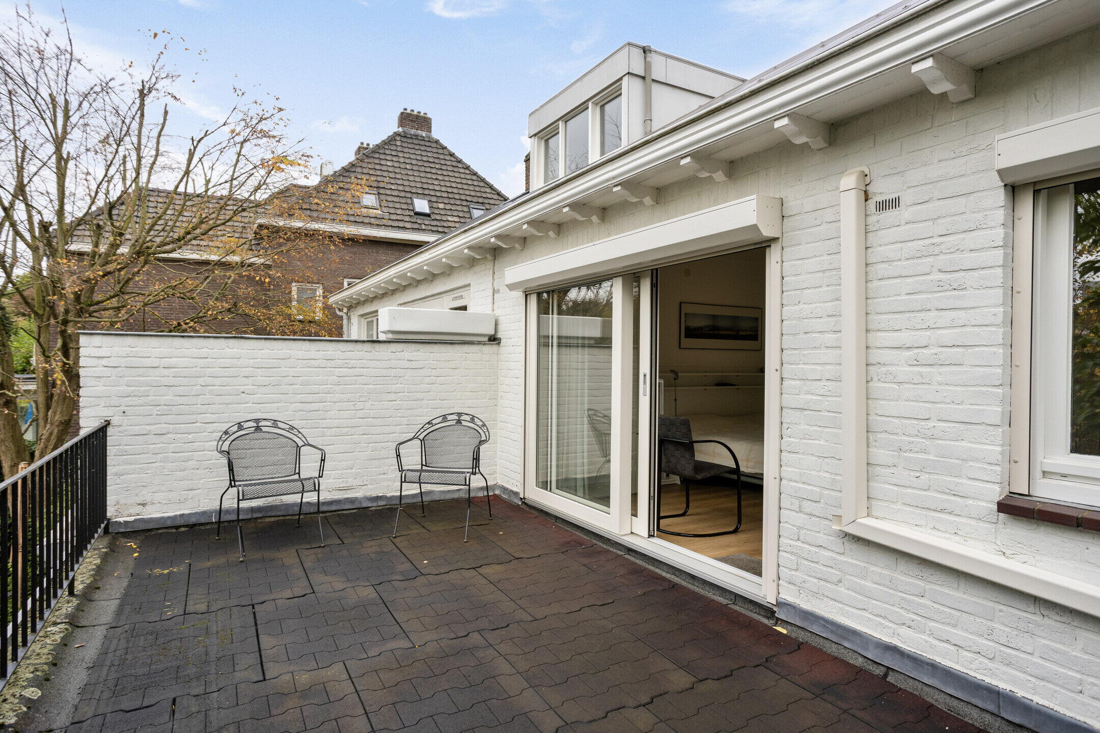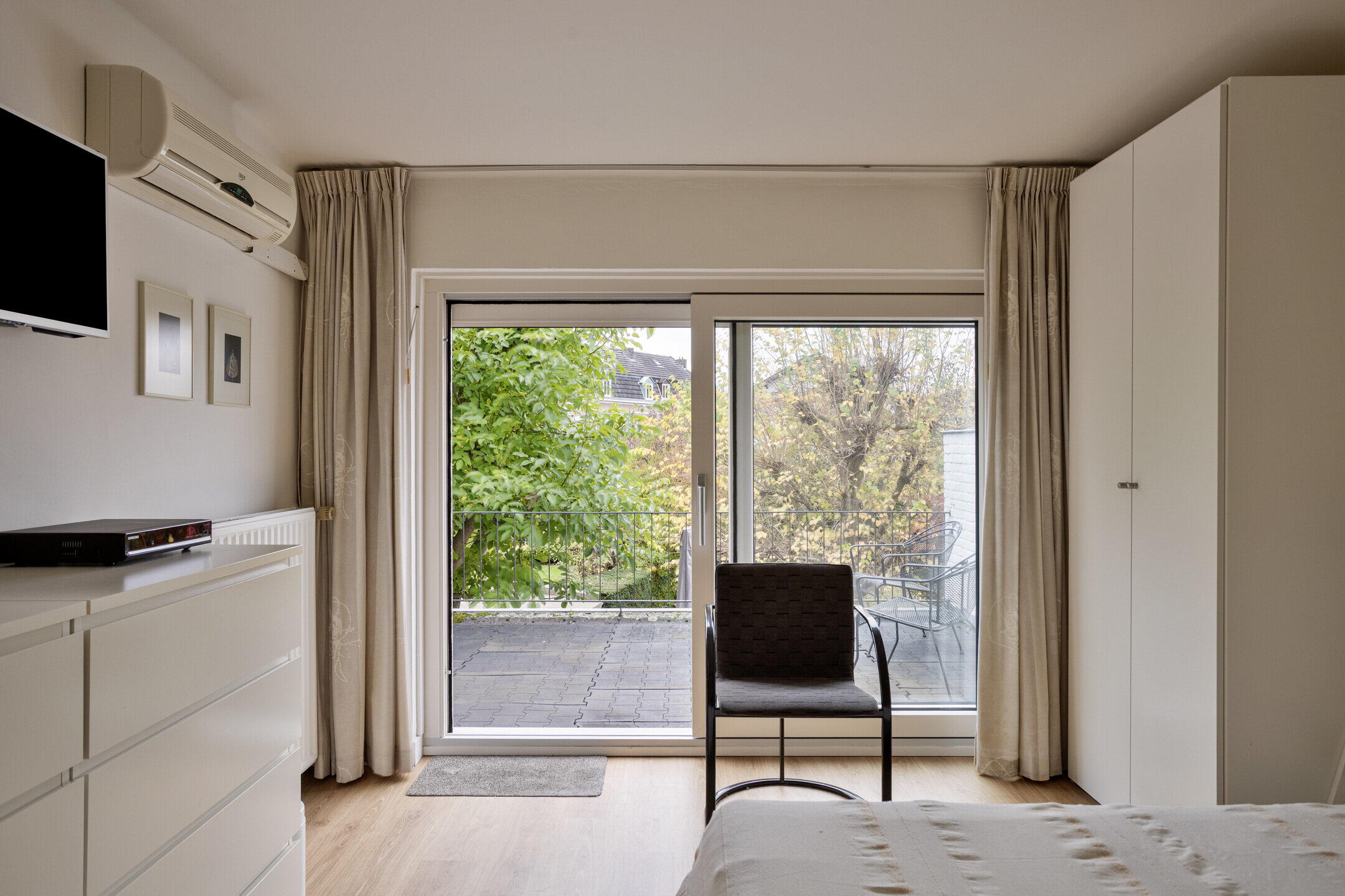 Op de eerste verdieping is een riant buitenterras gelegen aan de tuinzijde, bereikbaar vanuit de grote slaapkamer.