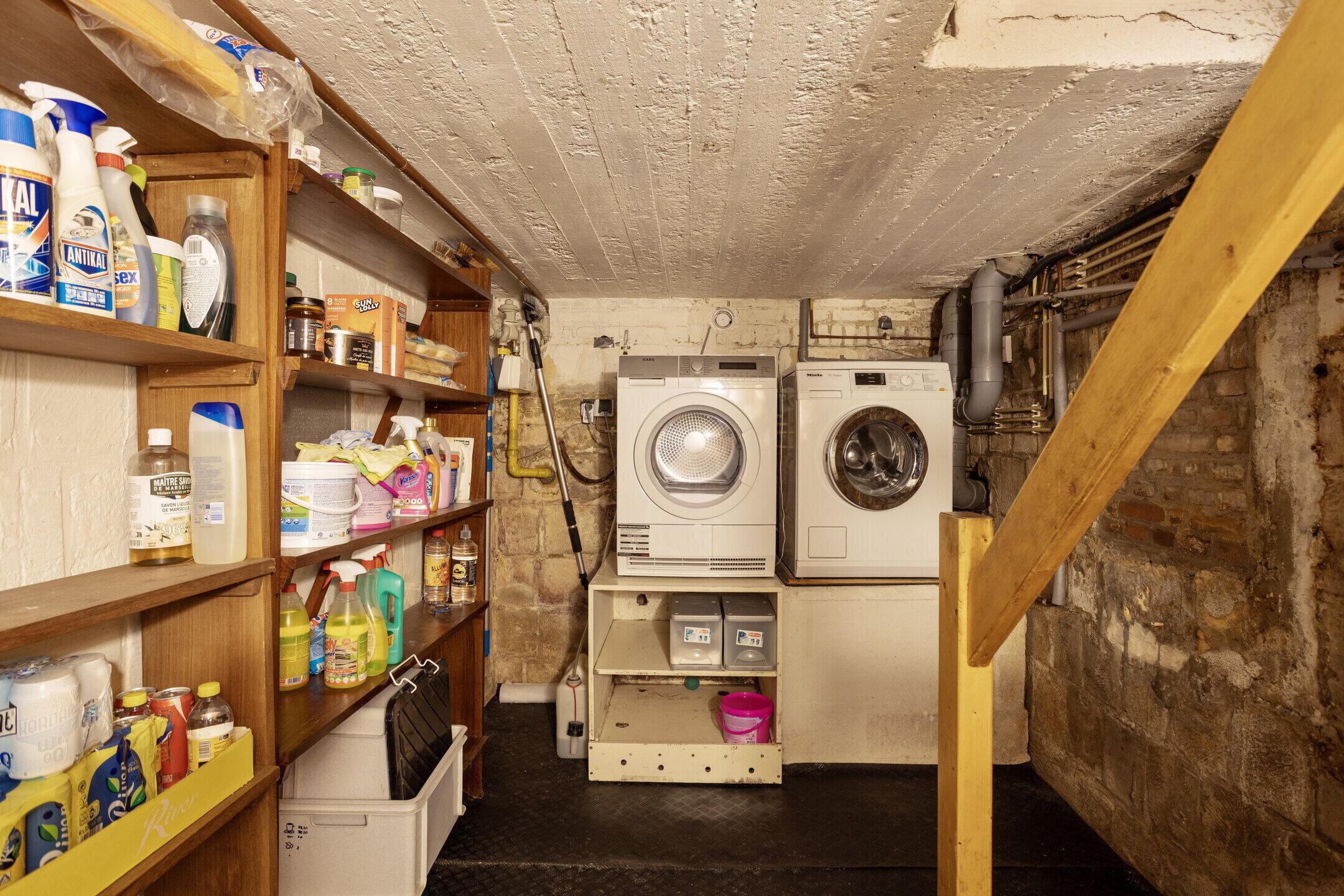 Mergelkelder (ca. 18 m², waarvan ca. 5 m² wijnkelder) met witgoedaansluiting, keukenboiler en voldoende bergruimte.