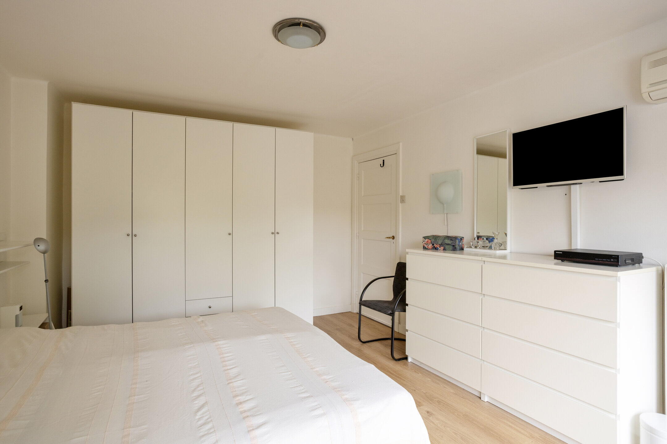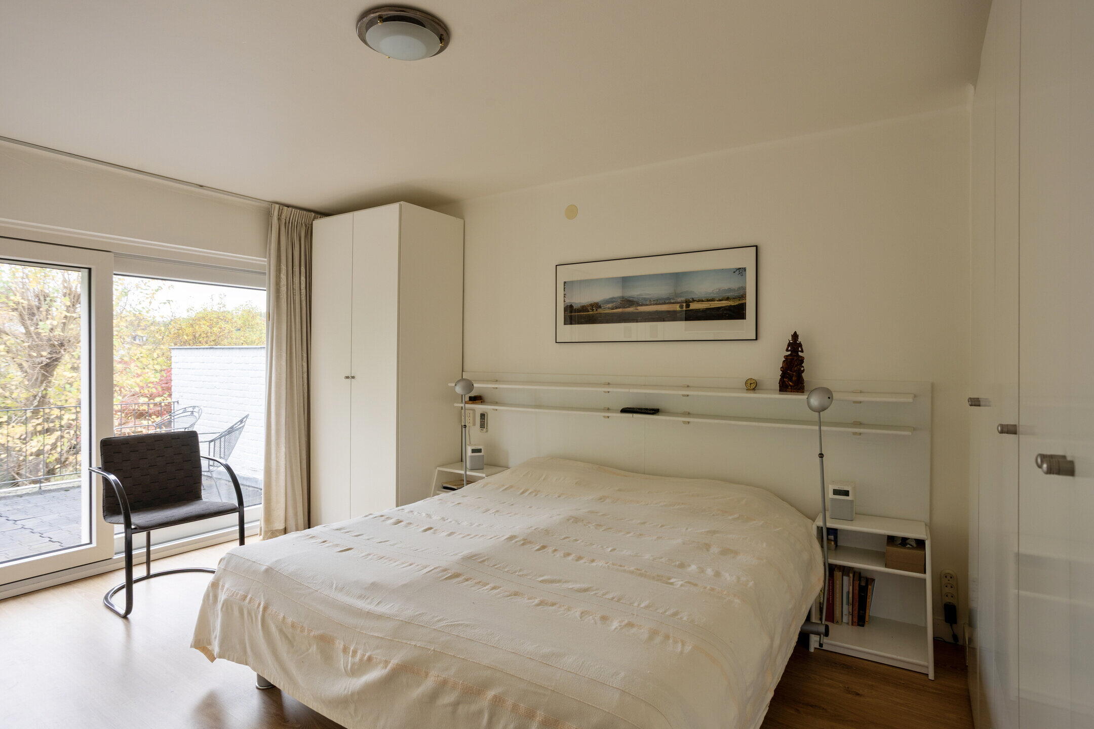 Slaapkamer 1 (ca. 16 m²), gelegen aan de rechter achterzijde, met airco en toegang tot het dakterras (ca. 18 m²) met uitzicht over de tuin.