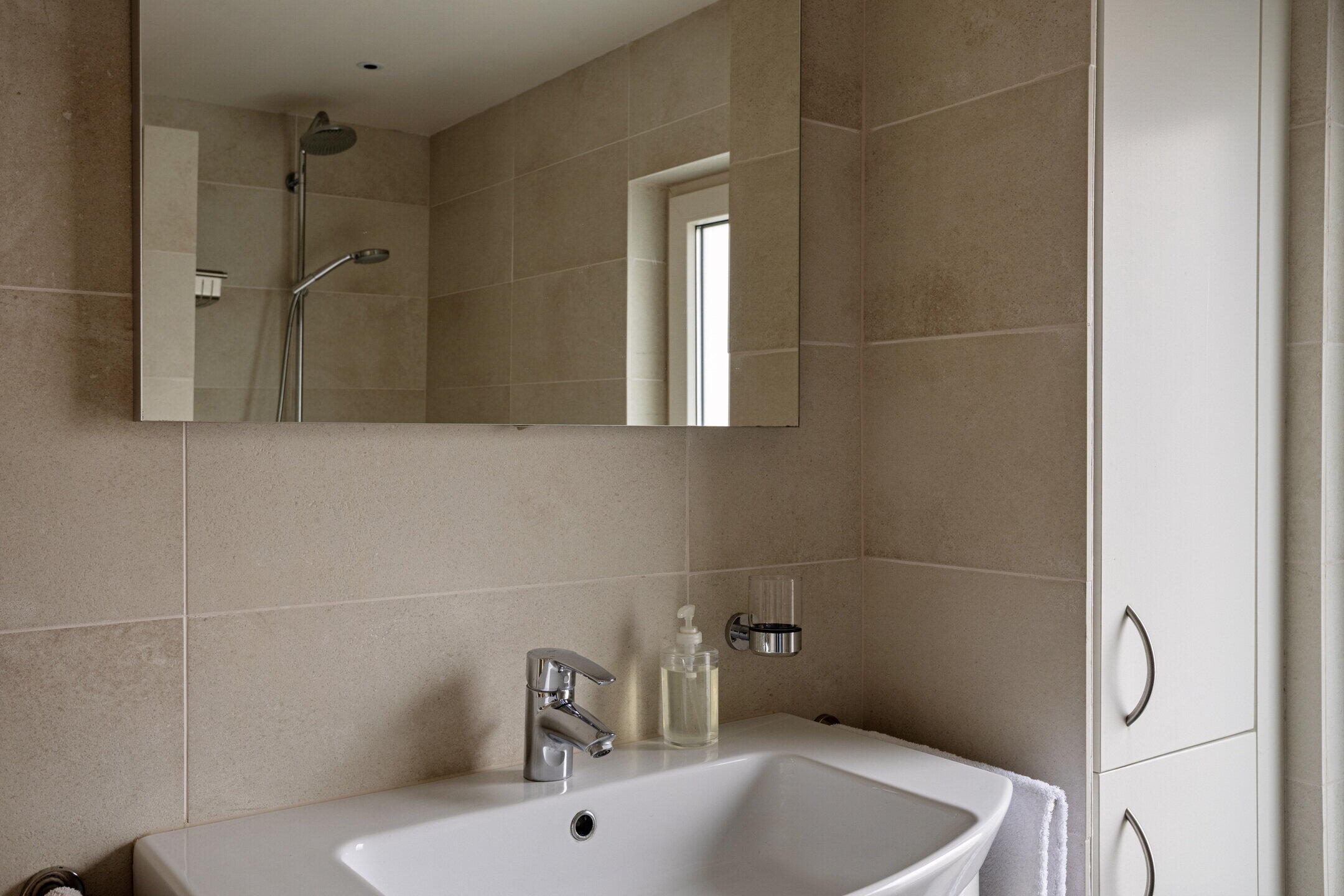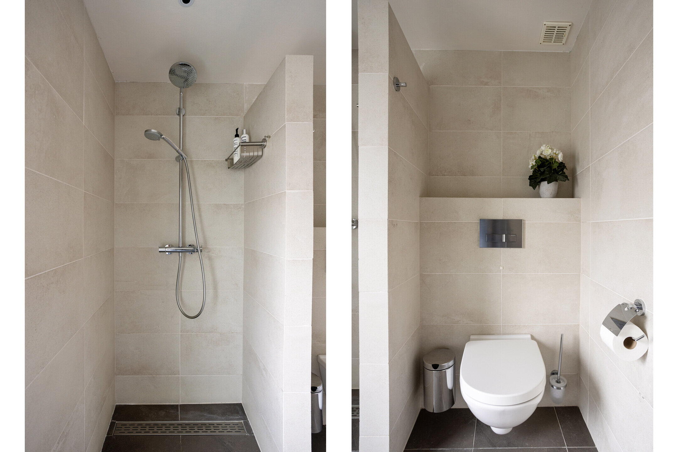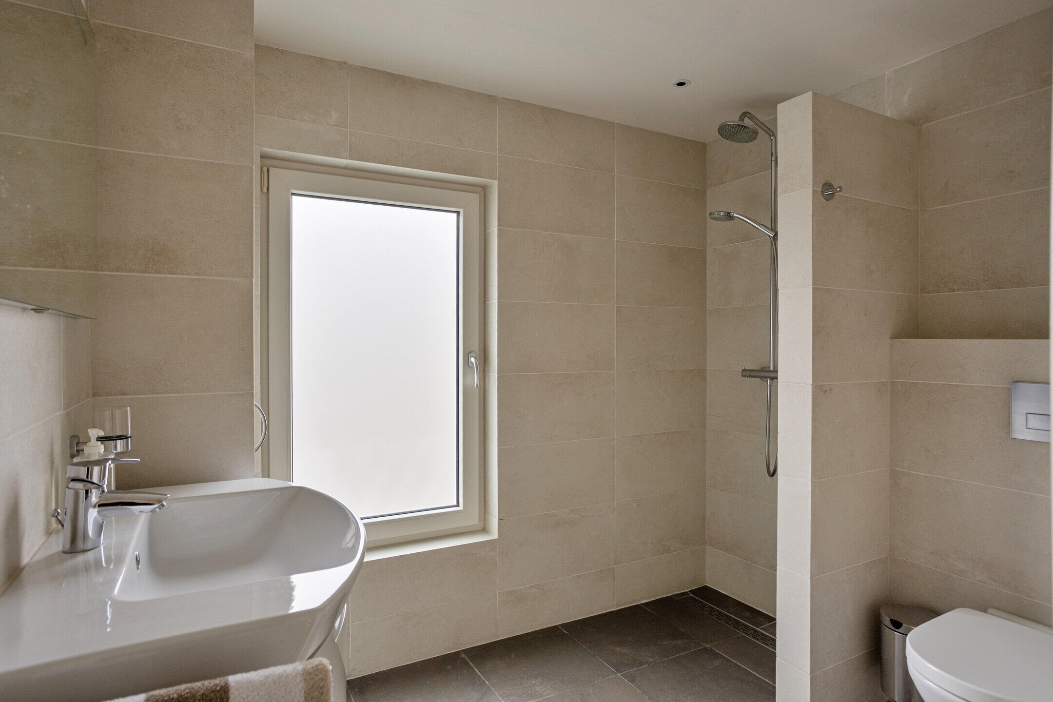 Volledig betegelde badkamer (ca. 5 m²) met inloopdouche, wastafelmeubel, tweede toilet en raam voor natuurlijke ventilatie, elektrische vloerverwarming.