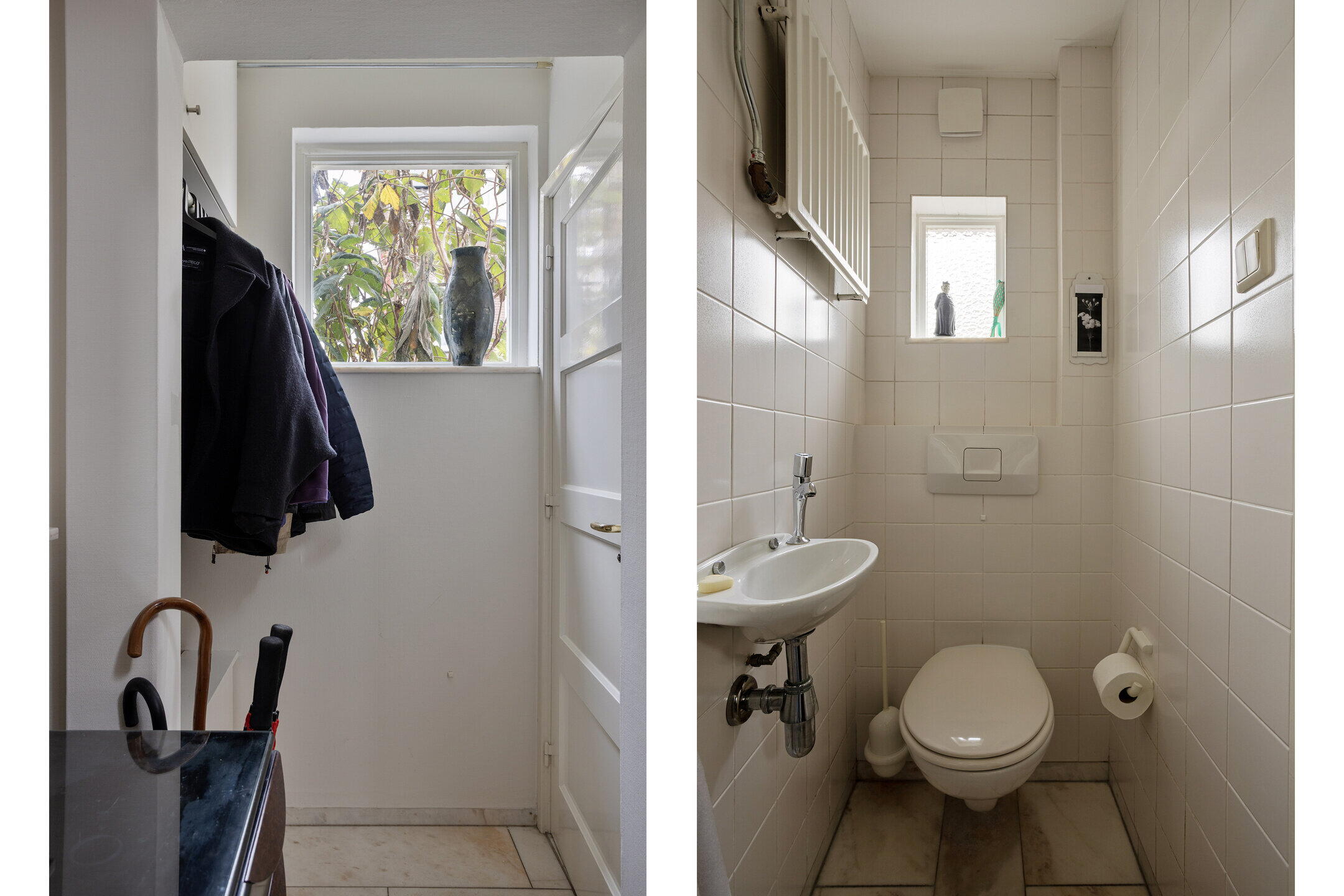 Entree/hal met trapopgang, toiletruimte met fonteintje en toegang tot de kelder, keuken en woonkamer.